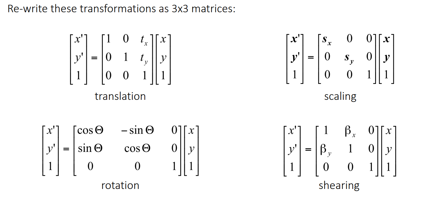 \ \begin{pmatrix} x' \\ y' \end{pmatrix} = \begin{pmatrix} 1 & 0 & t_x \\ 0 & 1 & t_y \\ 0 & 0 & 1 \end{pmatrix} \begin{pmatrix} x \\ y \\ 1 \end{pmatrix} \